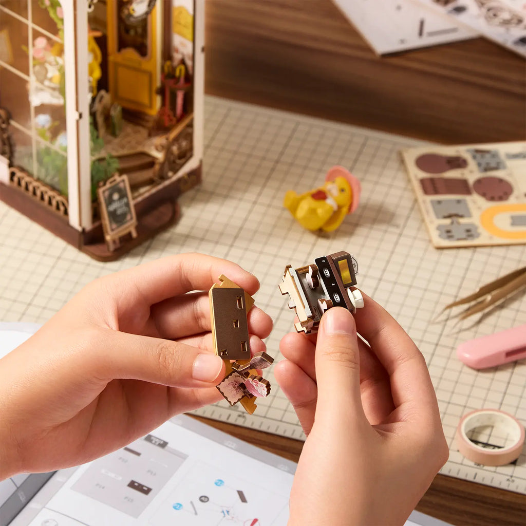 Ihr Bücherregal verwandelt sich in eine echte Miniaturwelt, in der man träumen kann. Der Bausatz besteht aus 171 Teilen aus Holz, Karton und Papier. Dank der Snapfit-Holzverbindungen und Aufkleberbögen ist kein Kleber erforderlich, wodurch das Bauen entspannt bleibt. Die Montage dauert etwa fünf Stunden, der Schwierigkeitsgrad beträgt vier Sterne, ideal für alle ab 14 Jahren, die detaillierte Bauprojekte lieben. Nach der Fertigstellung misst das Café 12 × 22,2 × 26,2 cm und wirkt stabil und authentisch. Kleine Details wie eine realistische Espressomaschine, Holzschränke und Mini-Leckereien vervollständigen das Szenario.