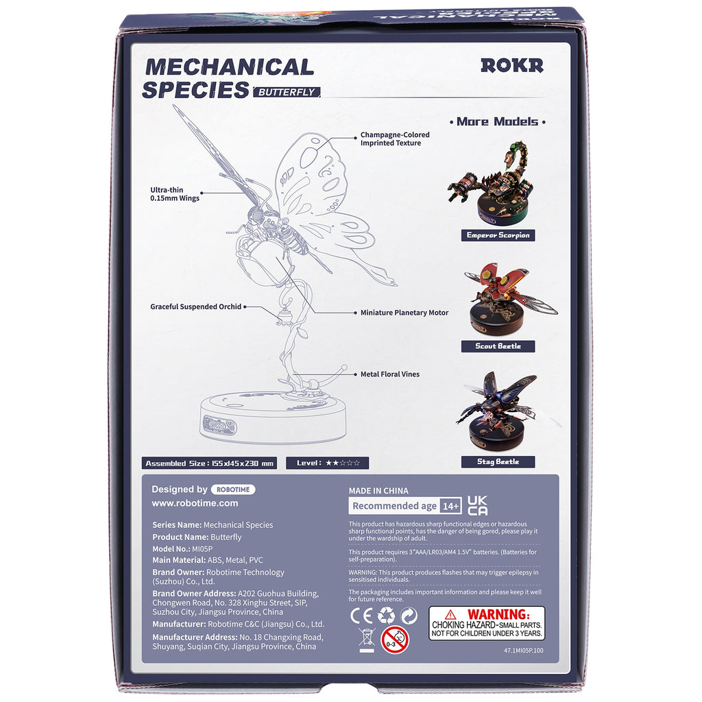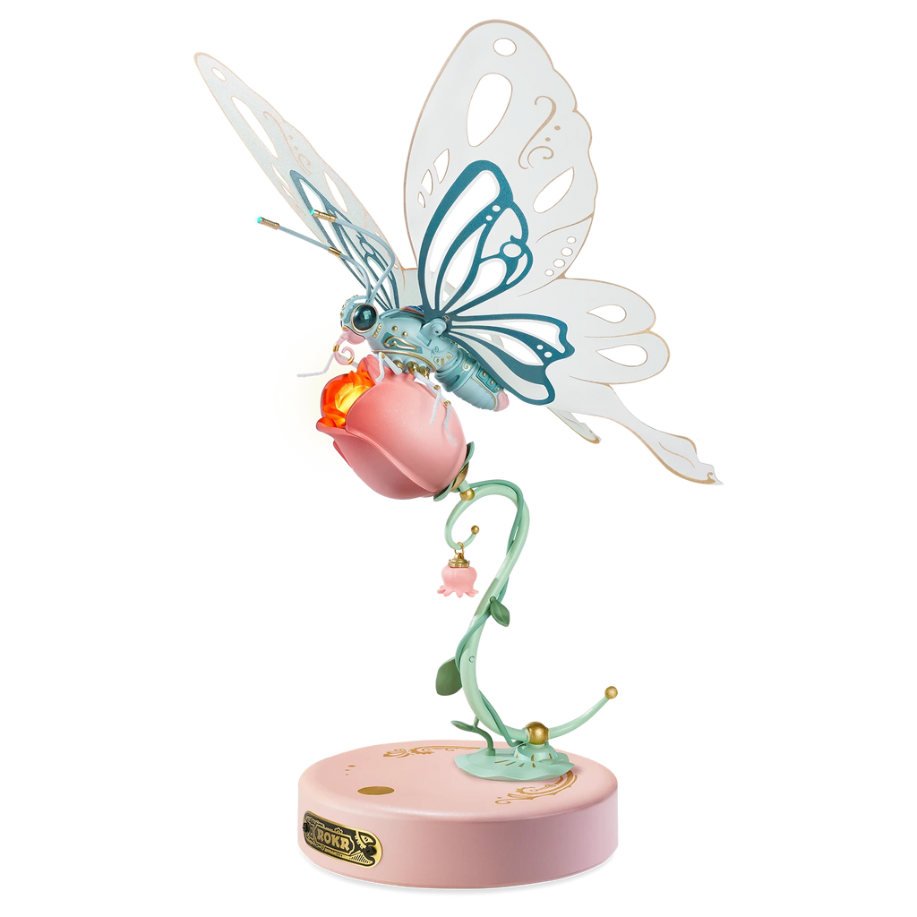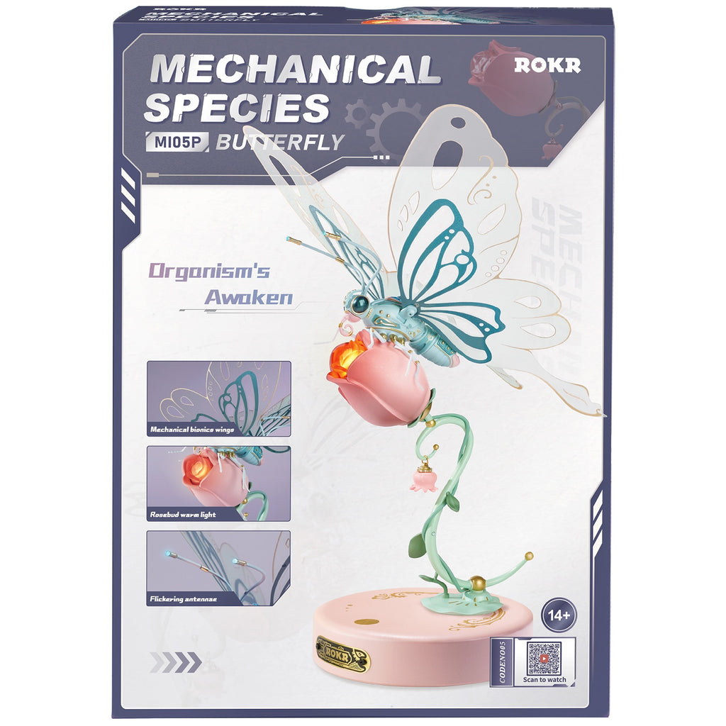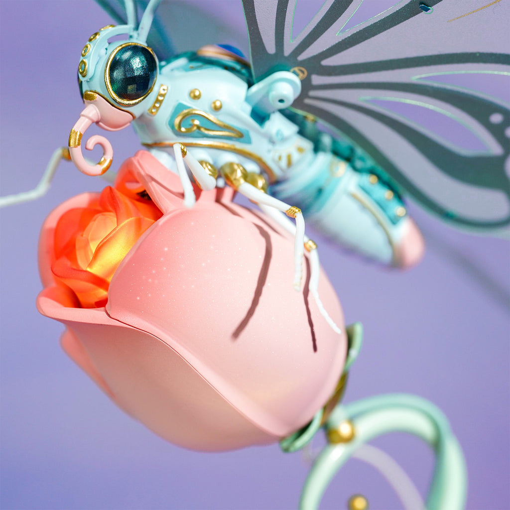 Ohne einen Laut von sich zu geben, ist ein wunderschöner Schmetterling auf einer rosa Rose gelandet. Die durchsichtigen Flügel des Schmetterlings bewegen sich sanft auf und ab. Bald wird er mit seinem rosa Zunge Nektar saugen. Aber das ist kein gewöhnlicher Schmetterling. Überall an seinem Körper hat er wunderschöne goldene Verzierungen. Und die hintern des Körpers ist rosa. Er hat weiße Beine mit ebenfalls goldenen "Knien". Die großen, blauen Facettenaugen blicken erstaunt in die Welt. Das Schöne ist, dass Sie dieses wunderschöne Insekt selbst mit diesem mechanischen Bausatz von ROKR bauen werden!