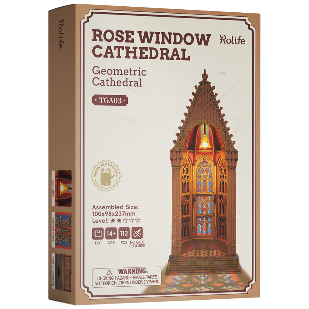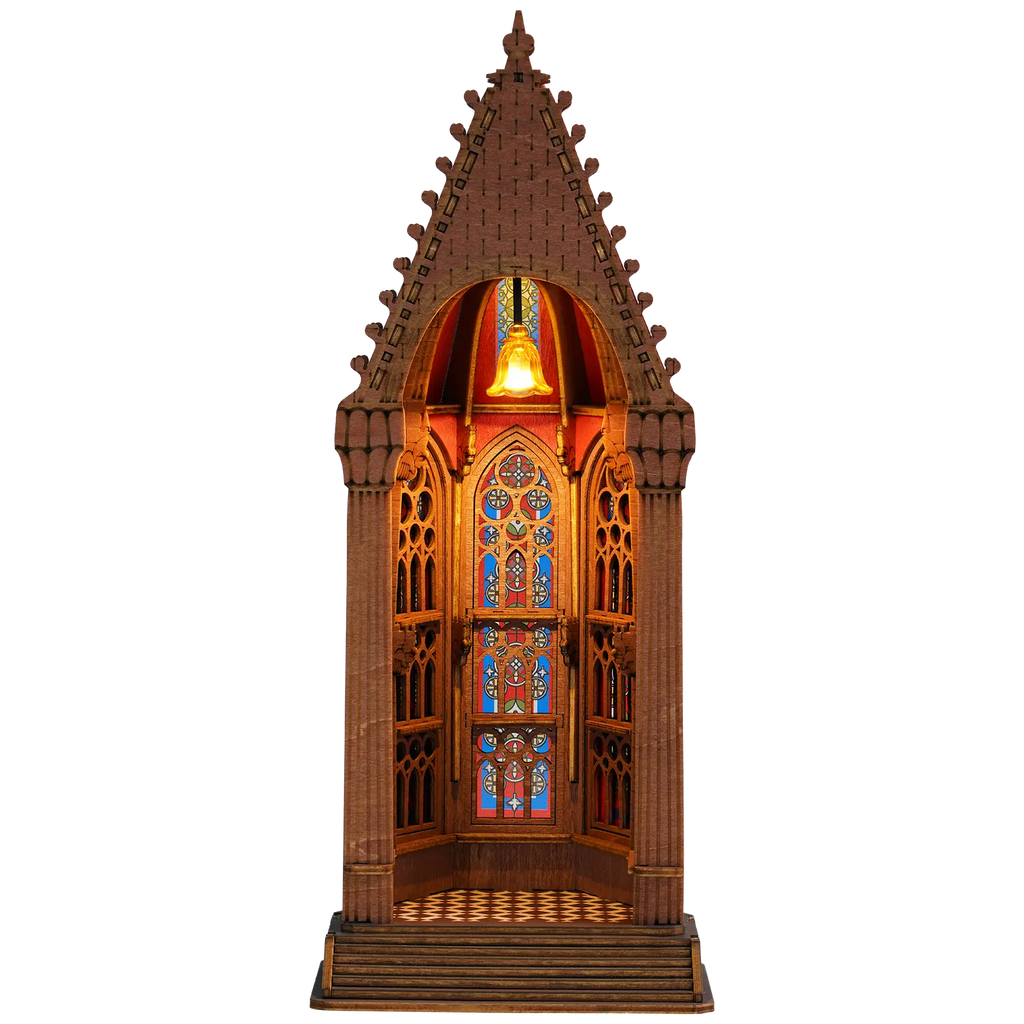 Treten Sie buchstäblich ein in die bezaubernde Welt der Geometric Cathedral von Rolife und lassen Sie sich vom Charme klassischer Architektur im Miniaturformat überraschen. Was sehen Sie, wenn Sie auf die offene Vorderseite blicken? Eine stattliche Kirche, eine stimmungsvolle Kapelle oder eine majestätische Kathedrale? Das breite Podest lädt Sie ein, in einen offenen Raum voller Charakter einzutreten. Hohe, reich verzierte Kirchenfenster mit Buntglas fangen das Licht auf magische Weise ein und der karierte Fliesenboden verleiht dem Ganzen eine authentische Ausstrahlung.