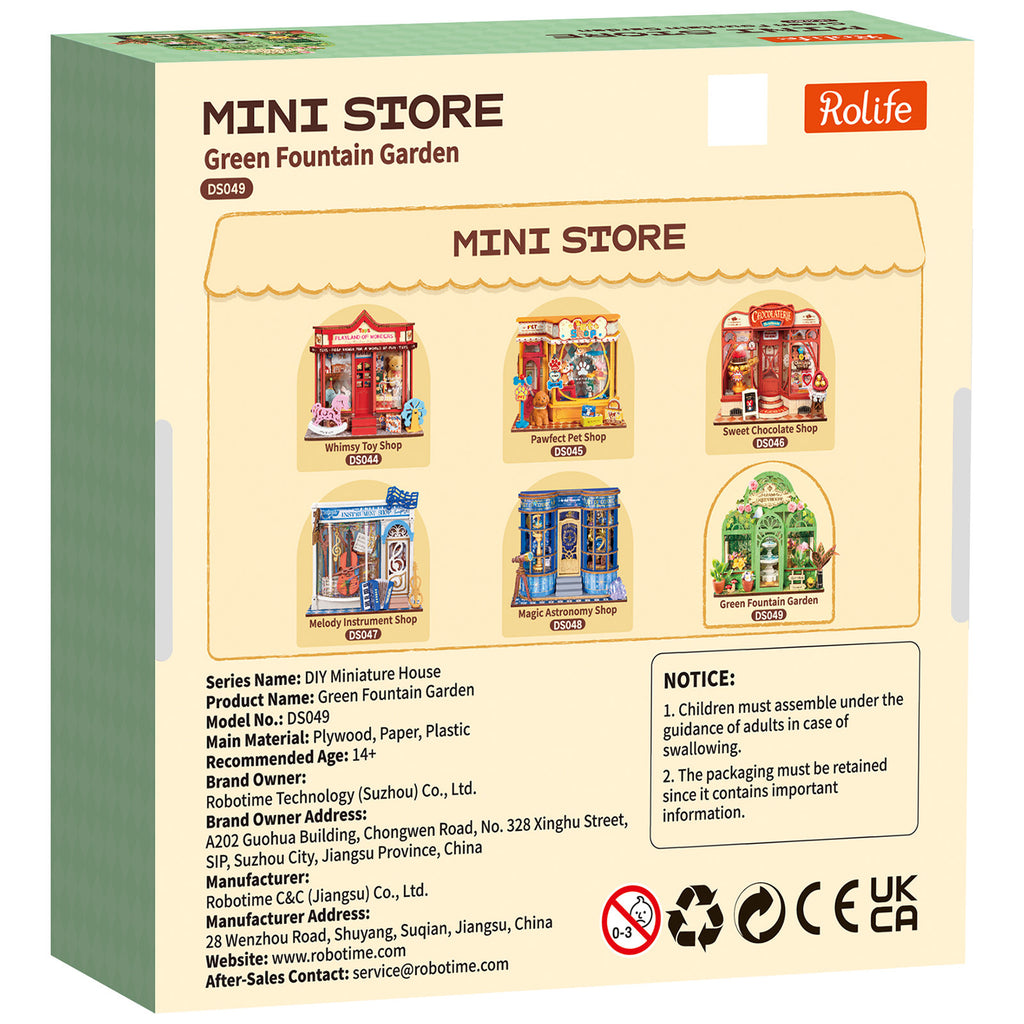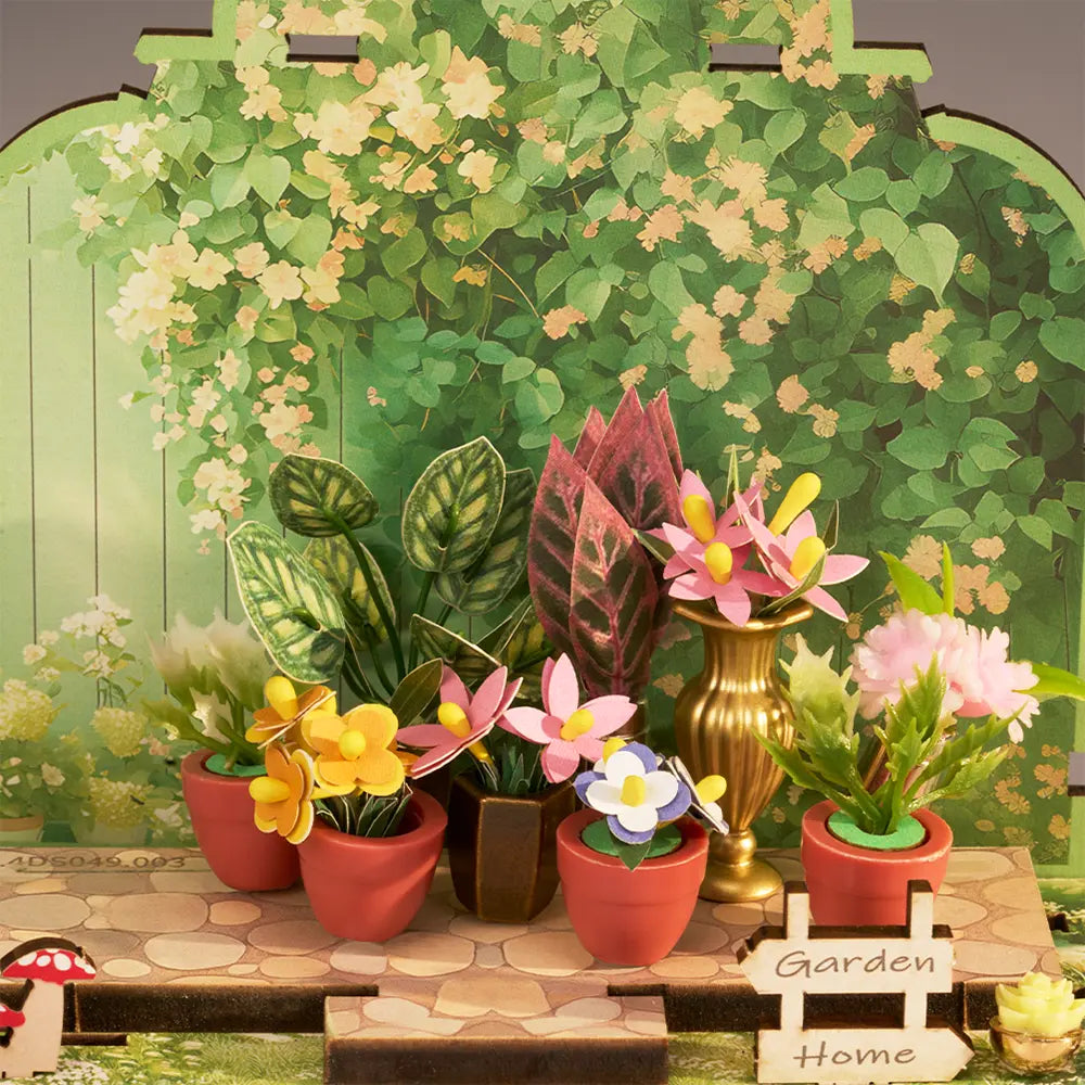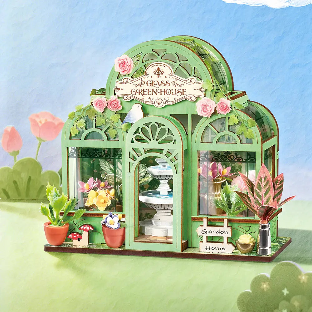 Der Robotime Green Fountain Garden zaubert Ihnen nämlich sofort ein Lächeln ins Gesicht, sobald Sie ihn bewundern. Sie sehen einen niedlichen Vintage-Blumenladen mit einer frischen grünen Fassade und einem „gläsernen” Gewächshaus, das das Licht einfängt. Die Bogenfenster und die Bogentür verleihen dem Miniaturmodell einen romantischen Charme, während eine Kletterrose mit zartrosa Blüten an der Fassade entlang wächst. Am Eingang sitzt ein süßes Turteltaubchen, das Sie willkommen heißt, und im Inneren zieht ein mehrstöckiger Brunnen sofort Ihre Aufmerksamkeit auf sich. Sie entdecken wunderschöne Sträuße mit gelben Blumen, rosa Blumensträuße und Topfpflanzen.