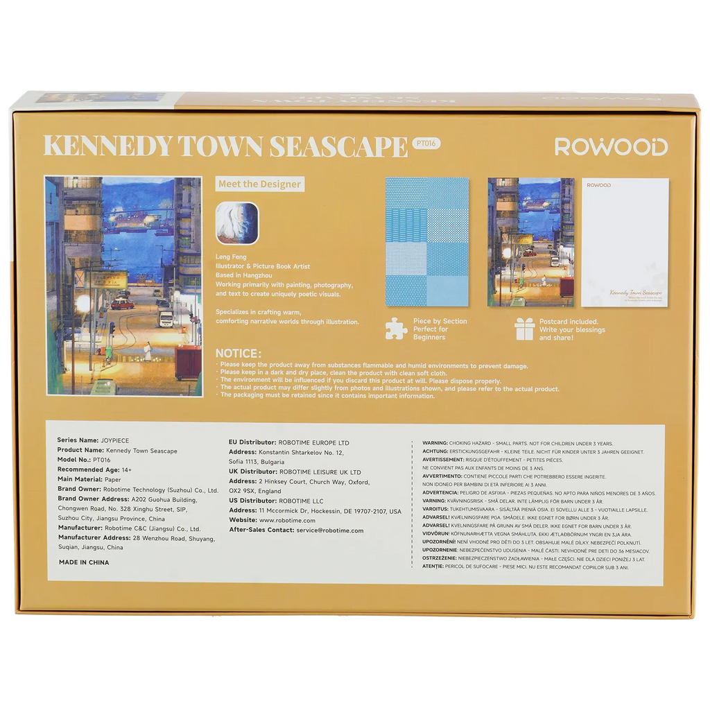 Mit 1000 Puzzleteilen für Ihr Hobby und einem kräftigen Format fühlt es sich an, als würden Sie ein Kunstwerk zum Leben erwecken. Die Puzzleteile bestehen aus dickem Premiumkarton, liegen angenehm in der Hand und klicken sanft ineinander. Auf der Rückseite ist das Puzzle in Abschnitte unterteilt, sodass Sie leicht sortieren können und genau sehen, welchen Teil der Stadt Sie gerade bauen. Das macht das Puzzle ein wenig zugänglicher, ohne an Herausforderung zu verlieren. Rechnen Sie mit etwa sechs Stunden Puzzlespaß, in denen Sie vollkommen in die abendliche Ruhe von Kennedy Town eintauchen.