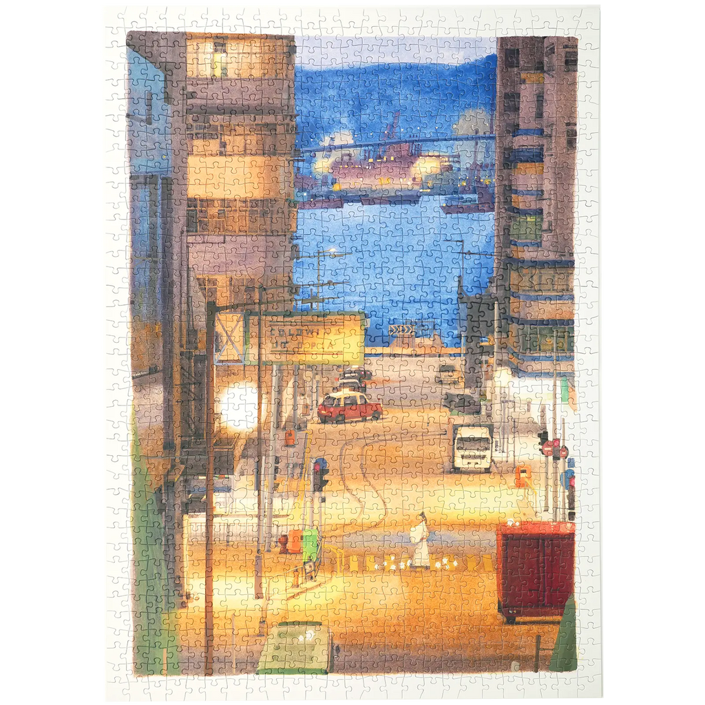 In zarter Aquarellfarbe vom talentierten Leng Feng aus Hangzhou festgehalten, nimmt dieses Puzzle Sie mit nach Kennedy Town. Der Malstil ist eine poetische Visualisierung, und das spüren Sie sofort, sobald Sie dieses Puzzle betrachten. Sie sehen hohe Bürogebäude mit warmen Lichtern in den Fenstern, geparkte Autos entlang der Straße und eine belebte Kreuzung, an der der Verkehr sanft durch die Kurven fließt. Die Straßenbahnlinie zieht wie ein ruhiger Takt durch die Stadt, und Absperrgitter markieren die Route. Zwischen den Gebäuden hindurch blicken Sie auf den Hafen.