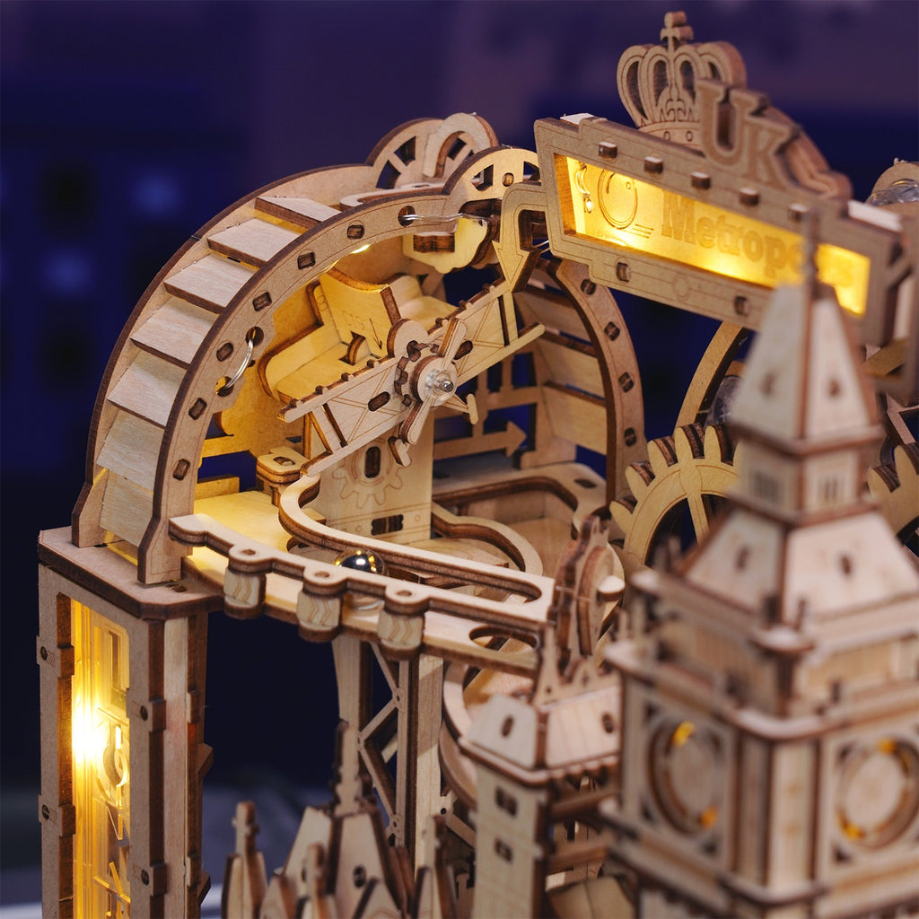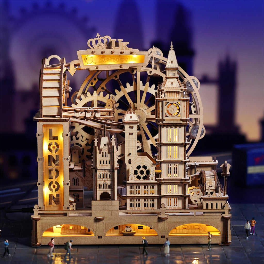 Technisch ist dieses Holzpuzzle ein wahres Meisterwerk. Mit 431 lasergeschnittenen Teilen und einer montierten Größe von 22,5 × 15,5 × 23,5 Zentimeter entsteht ein robustes, bewegliches Kunstwerk. Überall bewegt sich etwas – Sie wissen gar nicht, wohin Sie zuerst schauen sollen! Die Pen-und-Loch-Verbindungen sorgen für passgenaues Zusammensetzen ohne Klebstoff. Der starke Motor und die Schwerkraft lassen die Kugeln geschmeidig durch Londons Kulisse gleiten. Das naturfarbene Holz und die verborgenen Details machen das Modell herausfordernd und gleichzeitig eine Augenweide. Der Aufbau fördert Ihre Kreativität, Konzentration und Geduld – ideal für einen gemütlichen Bastelnachmittag.
