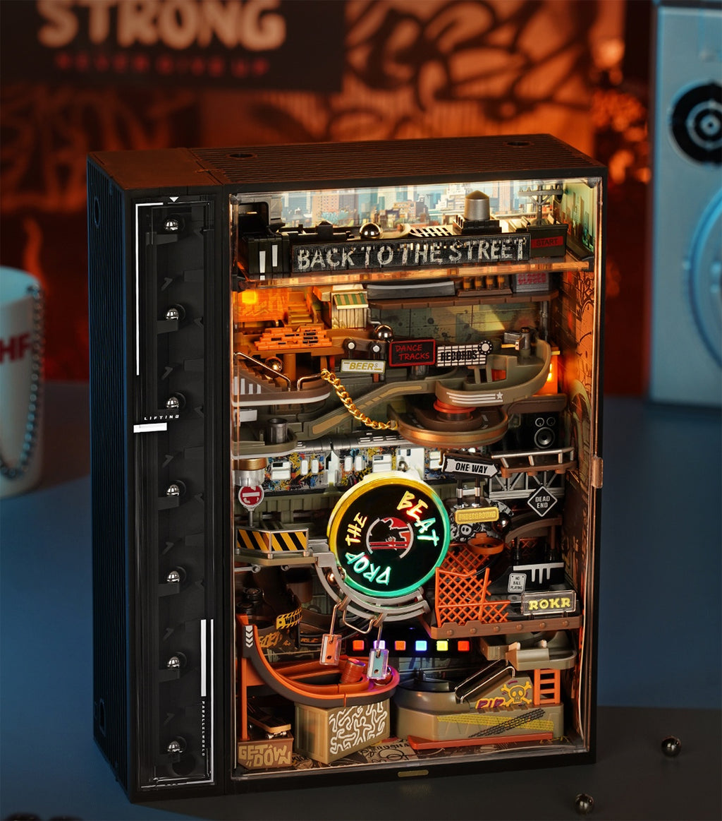 Willkommen in der Stadt voller Speed, blitzender Farben und Adrenalin! Die ROKR Hip-Hop-Street Marble Run ist kein gewöhnliches Bauset, sondern eine Hommage an Straßenkultur und Kreativität der 70er Jahre. Stellen Sie sich eine coole Miniaturstadt vor, in der Musik und Technik verschmelzen. Neonlichter blinken im Takt des Beats, eine Vinyl-LP dreht sich, und Metallkugeln rollen wie rhythmische Beats durch eine Welt voller Graffiti, Szenen und urbaner Vibes. Dieses Projekt ist ein Fest für Augen, Ohren und Geist.