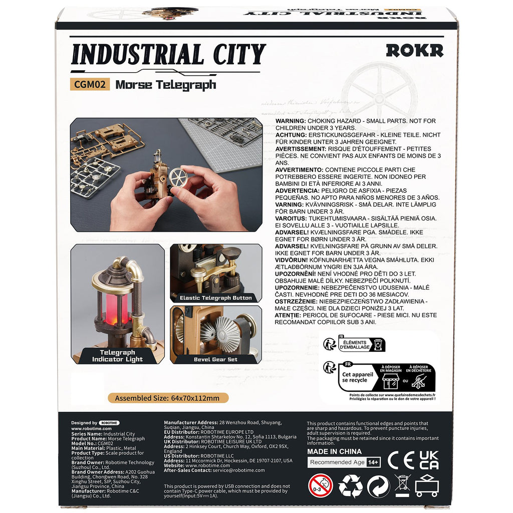 ROKR hat es wieder geschafft! Ein fantastisches Modell, bei dem alles piept, sich bewegt und aufleuchtet. Diesmal der Morse Telegraph, ein brillanter Kunststoff- und Metall-bausatz, mit dem Sie ein mechanisches Telegrafengerät bauen. Nicht einfach nur ein Modell, sondern ein Gerät voller Zahnräder und einer Klicktaste wie früher! Sie hören tatsächlich die Pieptöne, wenn Sie die Telegrafentaste drücken und sie elastisch zurückfedert. Die dunkelrote Kontrolllampe blinkt synchron mit jedem Tastendruck. Dank des Kegelradsets fühlt sich dieser Bausatz an, als würden Sie in das Zeitalter der Ingenieure des 19. Jahrhunderts zurückreisen.