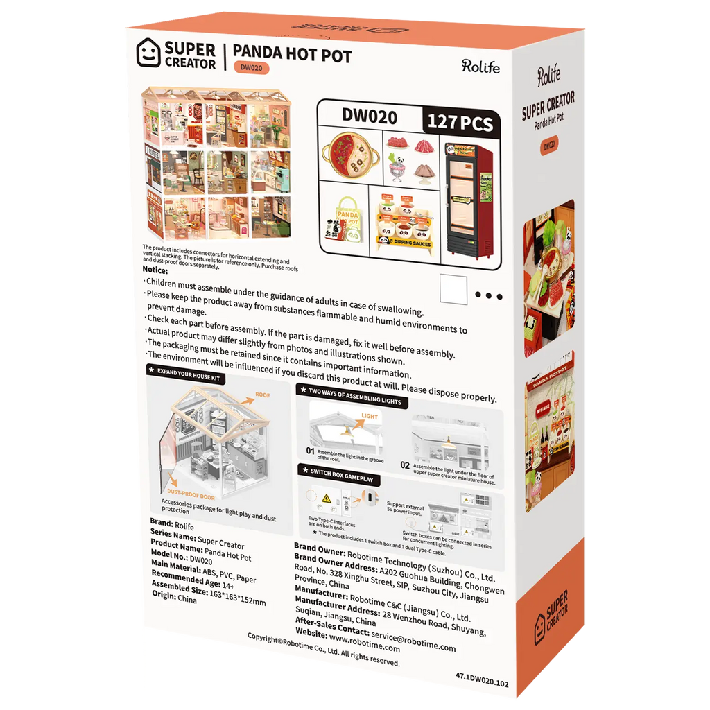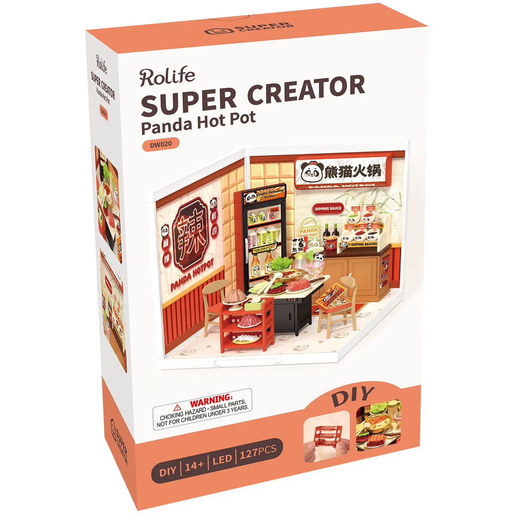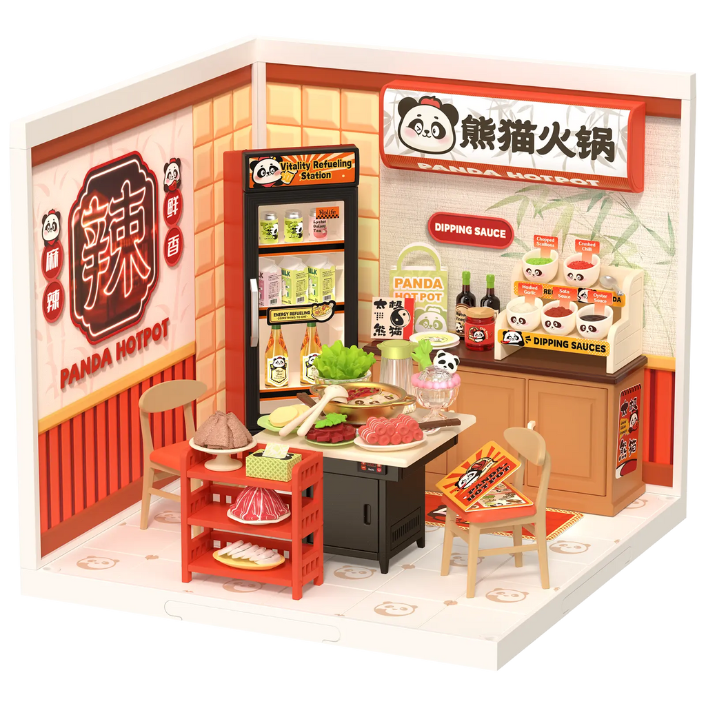 Der Rolife Panda Hot Pot ist nicht nur ein Genuss fürs Auge, sondern auch ein beeindruckendes Stück Miniaturtechnik. Die Türen des Kühlschranks und der Küchenschränke in diesem kleinen chinesischen Restaurant können offen stehen oder geschlossen bleiben, sodass dieses Häuschen wirklich lebendig wirkt. Dank des einfachen Click-and-Fit-Designs benötigen Sie keinen Kleber, um alles zusammenzusetzen. Mit 127 Teilen und einer Montagezeit von etwa 1 Stunde ist dieses Bauprojekt ideal für neue und erfahrene Miniaturbauer geeignet. Der Maßstab 1:24 und die endgültigen Maße von 16,3 x 16,3 x 15,2 Zentimetern machen dieses Kunststoff-Bauset passend für alle ab 8 Jahren.