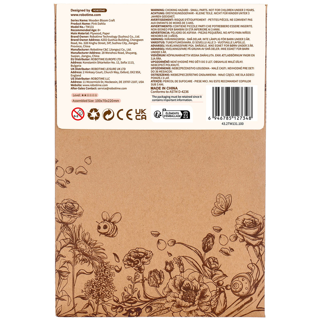 Die vollen Blütenblätter dieses Holzbaukastens sind verspielt geschichtet und verlaufen von zartem Pastellrosa zu einem wärmeren, tieferen Farbton, wodurch die Blume fast echt wirkt. Das Holz fängt das Licht subtil ein und verleiht der Dahlie eine überraschend lebendige Ausstrahlung. Neben der offenen Blume befindet sich eine Knospe, die sich jeden Moment öffnen kann. Der frischgrüne Stiel und die Blätter sorgen für einen natürlichen Kontrast und halten das Ganze schön im Gleichgewicht. In der Pappvase passiert noch mehr: Fröhliche Illustrationen von Blumen, Schmetterlingen und feinen Details zaubern Ihnen ein Lächeln ins Gesicht.