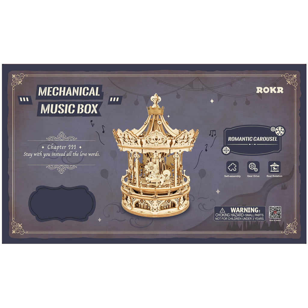Bögen, Blumen und Herzen. Das kann man romantisch nennen, daher auch der Name für diesen tollen Bausatz von ROKR: das romantische Karussell. Dieses Retro 3D Puzzle hat ein wirklich hochwertiges Design und ist sorgfältig mit schönen Ornamenten gepflegt. Ein gutes Karussell muss sich drehen. Wenn Sie das Holz Spieluhr Karussell mit der mechanischen Feder aufgezogen haben, setzt sich alles in Bewegung. Am Boden des Romantisches Karussells sehen Sie Herzen und Sterne, die hinter den Toren vorbeiziehen. Das Zentrum, um das sich alles dreht, hat wie die antiken Jahrmarktkarussells schöne Rahmen, die früher Spiegel enthielten. Die Pferde tanzen auf und ab, ihre Körper bewegen sich bei jedem Sprung nach vorne und Dekorationen bewegen sich rhythmisch durch das Dach. Basteln Sie mit uns?