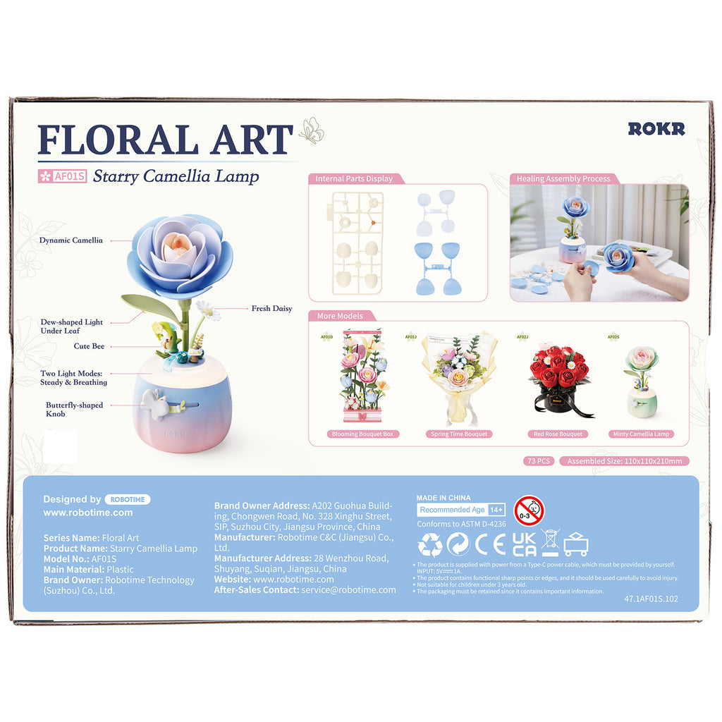 Warm und verträumt – das ist die Nachttischlampe Starry Camellia, die Sie mit dem ROKR-Bausatz selbst zusammenbauen können.