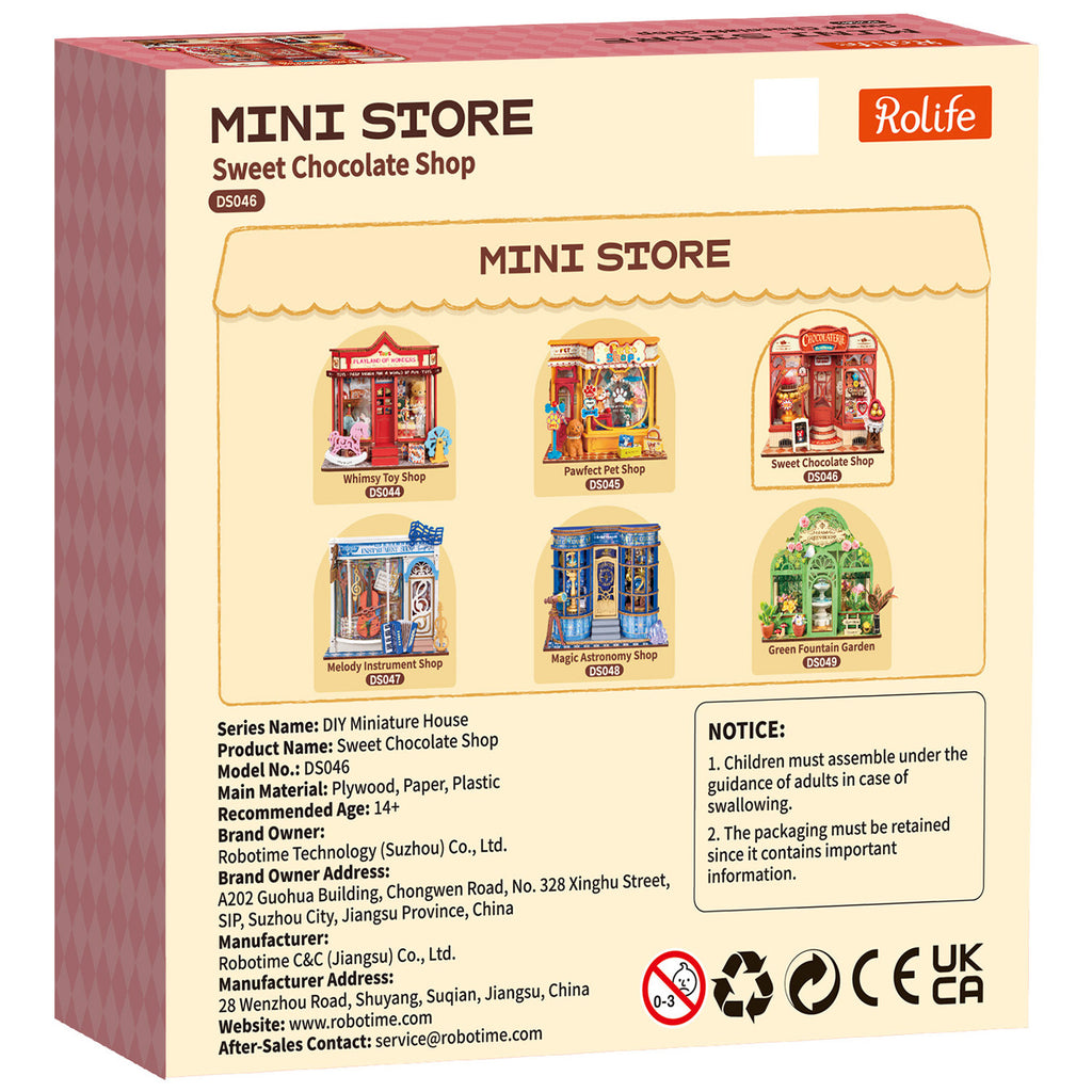 Und dann sind Sie mit dem Bau fertig und stellen diesen bezaubernden Schokoladenladen auf. Dann fallen Sie in ein Loch. Sie wollen mehr! Kombinieren Sie es mit anderen Schmuckstücken aus der Mini Store-Serie von Rolife. Kombinieren Sie es perfekt mit dem Melody Instrument Shop, dem Magic Astronomy Shop und dem Green Fountain Garden, um eine komplette Miniaturwelt voller Atmosphäre zu schaffen. Zusammen bilden sie eine charmante kleine Straße, die immer wieder überrascht und Bewunderung hervorruft.