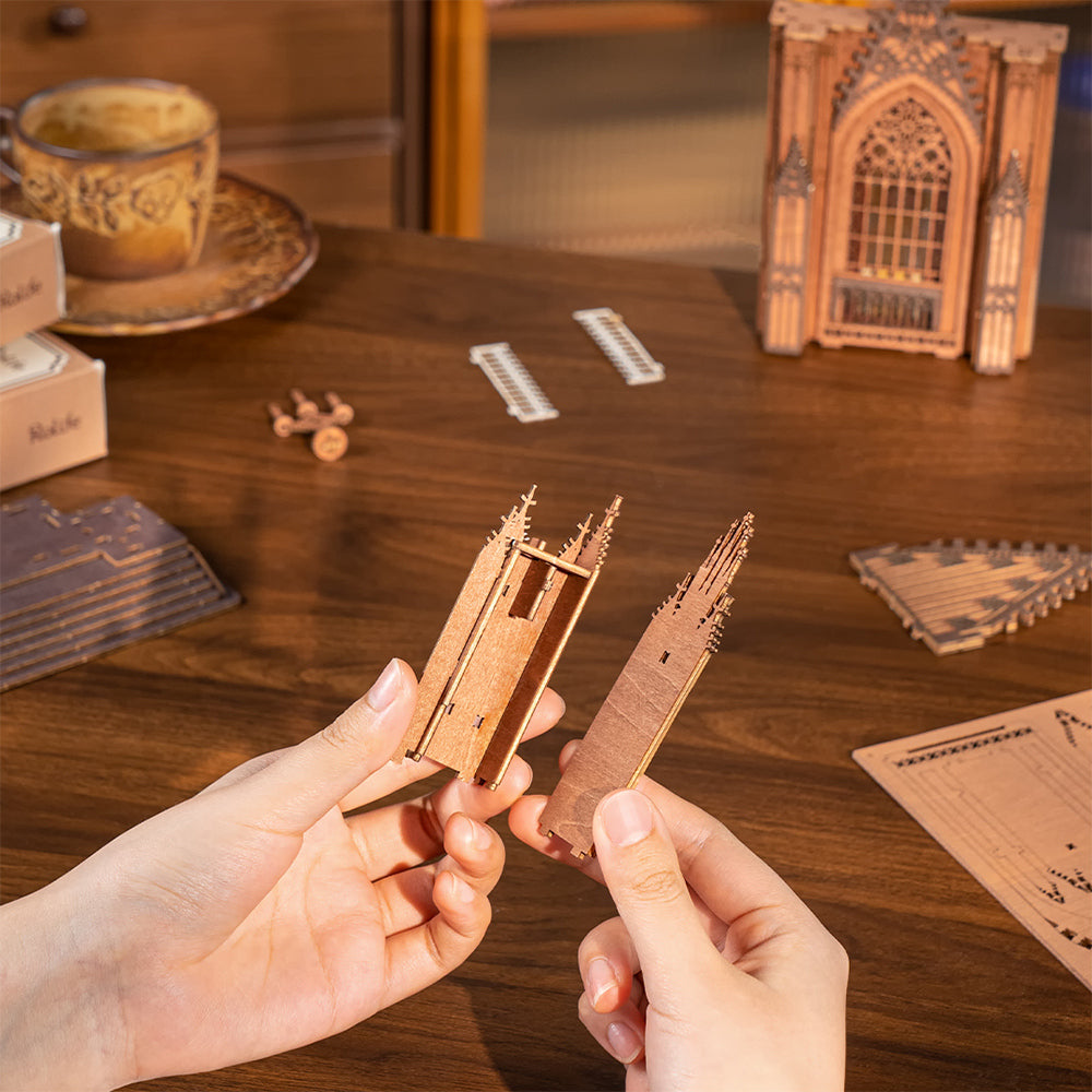 Die Twin-Tower Cathedral besteht aus 111 Teilen und hat einen Schwierigkeitsgrad von 3 Sternen – genau anspruchsvoll genug, um sich konzentriert zu beschäftigen, ohne dass es zu kompliziert wird. Mit Maßen von 135 Millimetern Breite, 95 Millimetern Tiefe und 259 Millimetern Höhe ist dieser Holzbausatz kompakt und dennoch beeindruckend detailreich. Alles wird einfach zusammengesteckt, ganz ohne Klebstoff und ohne Farbe, da die Teile bereits farbig gestaltet sind. Das bedeutet sorgenfreies Bauen und sofortiges Genießen des Ergebnisses. Die LED-Beleuchtung funktioniert über USB-C, angenehm umweltfreundlich und ganz ohne Batterien.